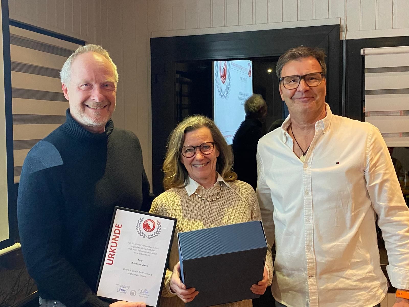 Als Dank und in Anerkennung der 30 jährigen Vorstandsarbeit (davon 14 Jahre als Geschäftsführer und danach bis heute als Kassenwart), 55jähriger Vereinsmitgliedschaft und der hohen Verdienste um den Grefrather Tennisclub wurde Herrn Günter Trienekens eine Ehrenurkunde übergeben, mit der er zum Ehrenmitglied des Grefrather Tennisclub Rot-Weiß e.V. ernannt wird.